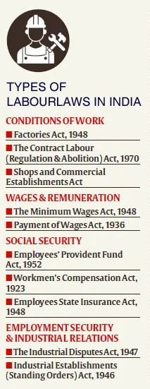 - Factories Act, 1948: Governs working conditions, machinery maintenance, safety standards, working hours, rest breaks, canteens, and crèches.