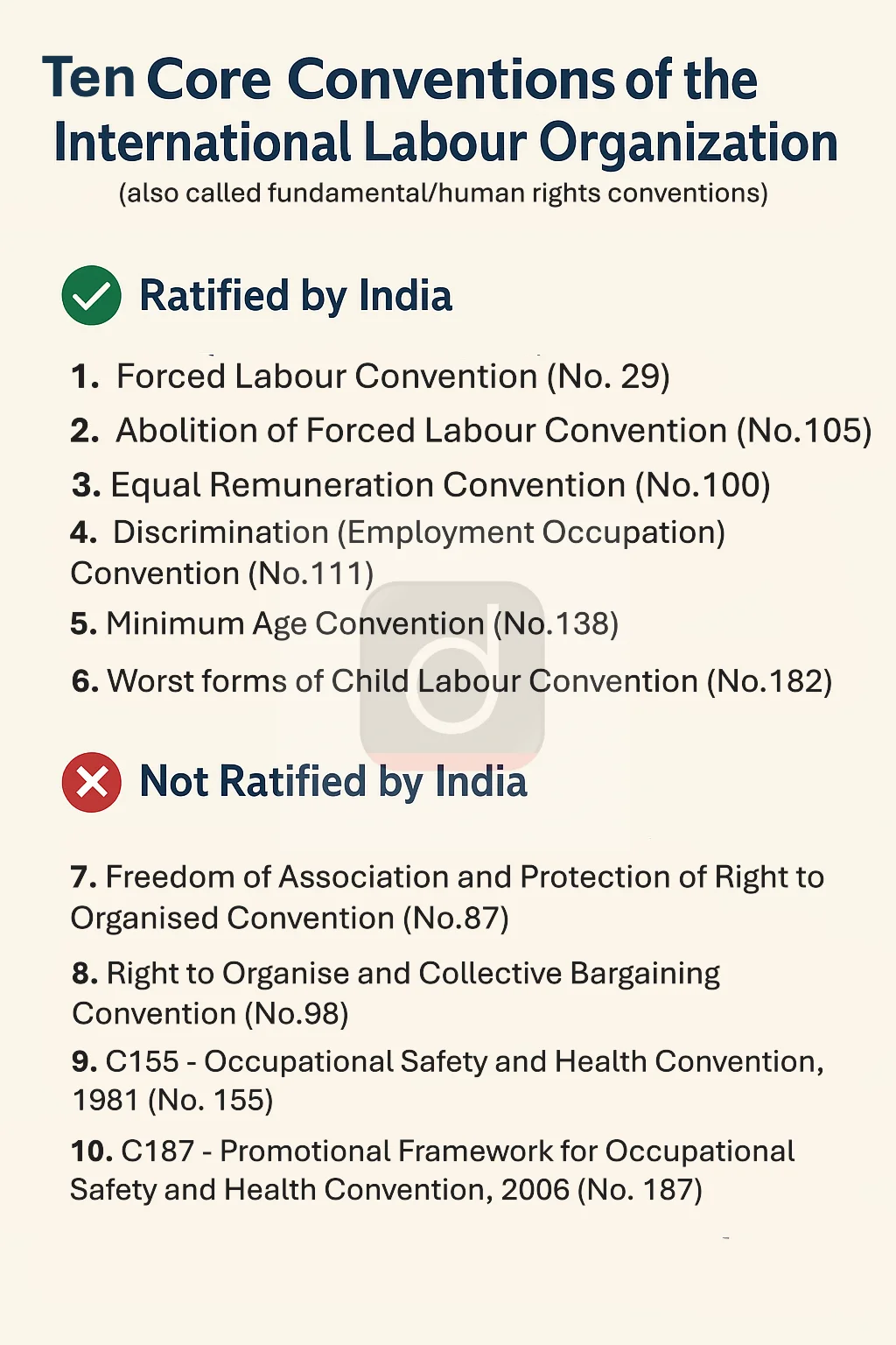 - Occupational Safety, Health and Working Conditions (OSHWC) Code, 2020: Consolidates 13 previous labour laws into a single framework. OSHWC Code seeks to regulate safety, health, and working conditions across sectors, though full implementation is pending.