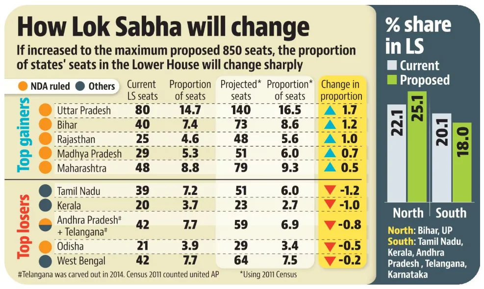 - In fact, all states are projected to see roughly a 50% increase in their total seat count (e.g., Tamil Nadu moving from 39 to around 58 seats).