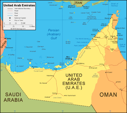 - The UAE is bordered by Saudi Arabia to the west and south, and Oman to the east and northeast. It also shares maritime borders in the Persian Gulf with Qatar and Iran.
