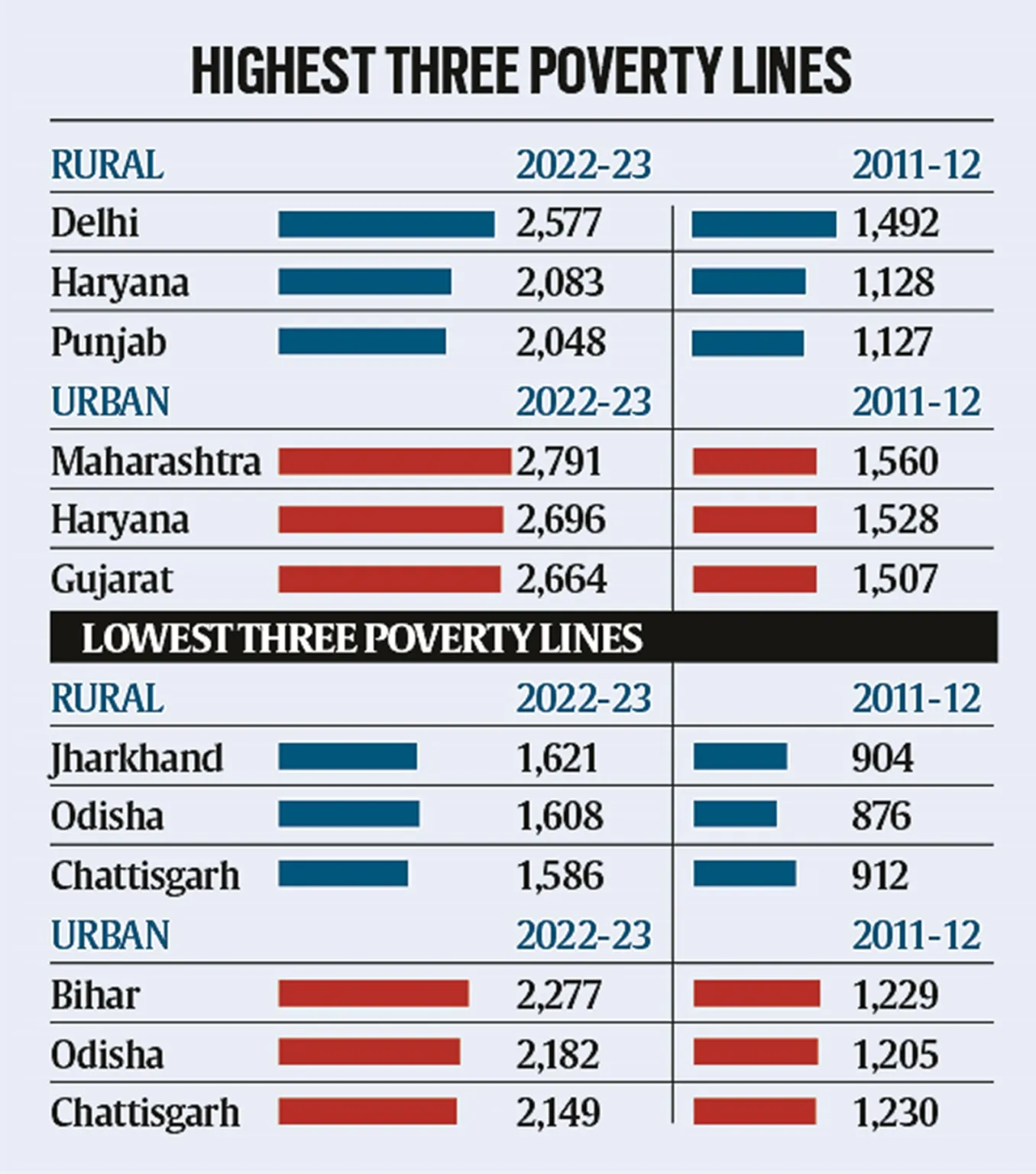- Biggest Improvements: Odisha and Bihar showed the largest decline in poverty levels since 2011-12, with rural poverty in Odisha falling from 47.8% to 8.6% and urban poverty in Bihar falling from 50.8% to 9.1%.