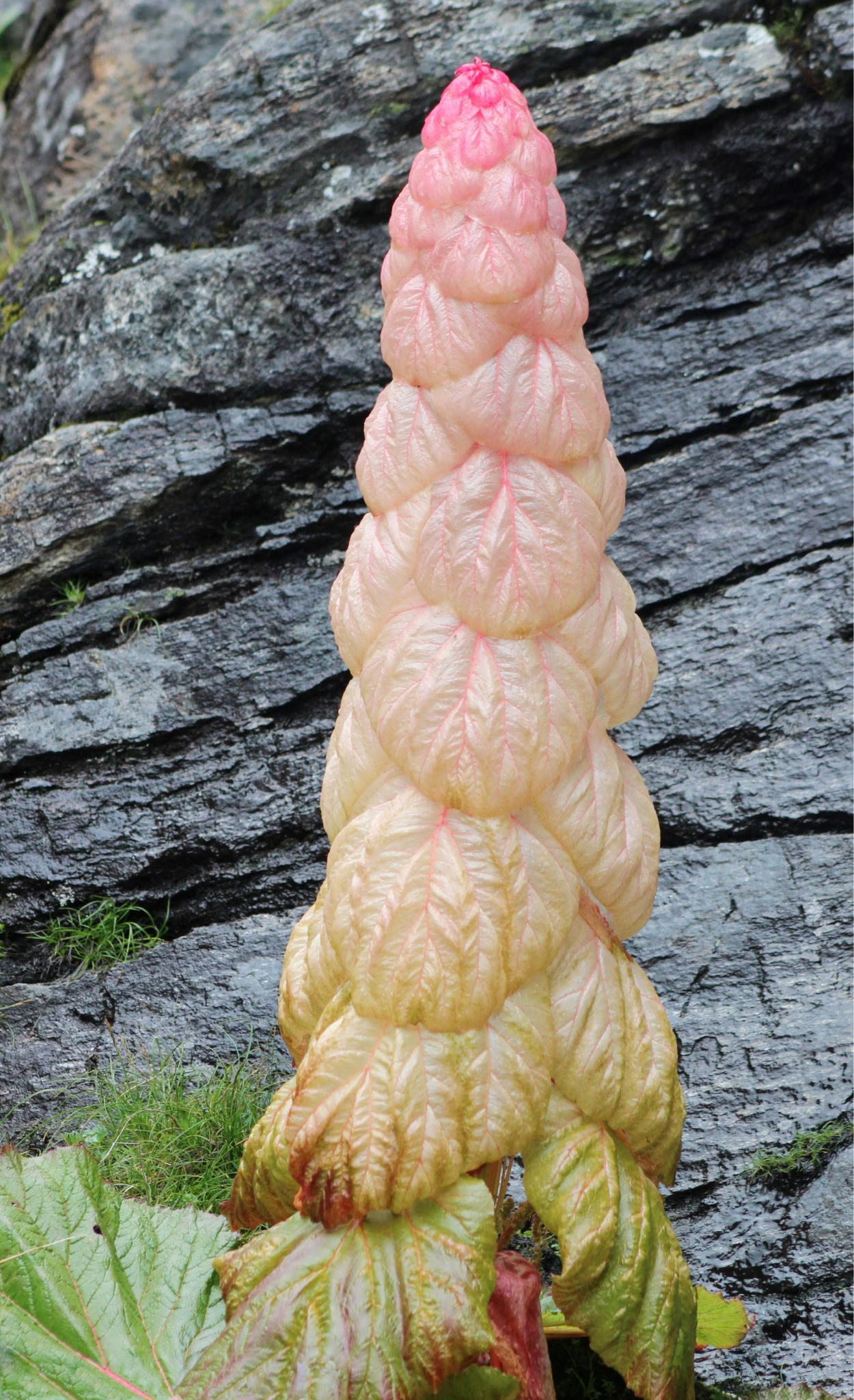 - Distinctive Morphology: Its tall, translucent bracts form a natural glasshouse that traps heat, protects the flowers from freezing winds and intense UV radiation, and gives the plant a luminous, tower-like appearance against the Himalayan landscape.