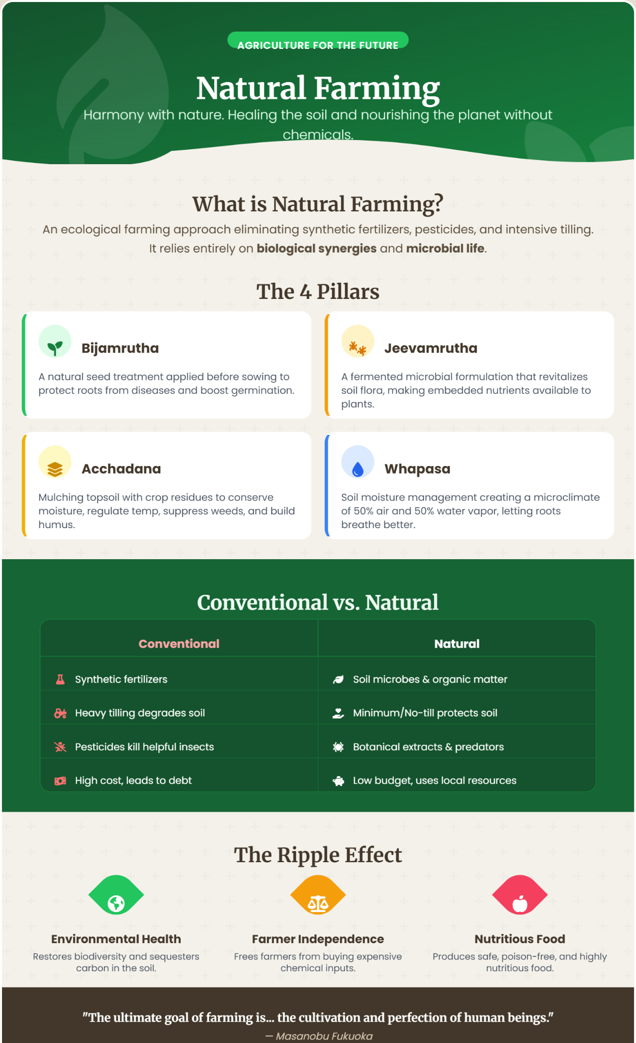 - By abandoning toxic pesticides, natural farming revitalizes the intricate soil food web, allowing beneficial insects, earthworms, and micro-fauna to thrive.