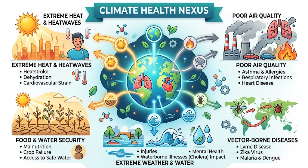 Climate change is no longer a distant environmental concern but an immediate public health emergency, with India witnessing rising heatstroke deaths in regions like Odisha and Telangana and shifting dengue peaks from September to November in Delhi-NCR. Expanding vector habitats and erratic rainfall are increasing the spread of diseases like malaria into previously unaffected regions such as Himachal Pradesh. Simultaneously, elevated PM2.5 levels and heat stress are aggravating cardiovascular, respiratory, and renal disorders, contributing to a growing non-communicable disease burden. Coupled with climate-induced food insecurity and malnutrition, these trends underline that climate change is fundamentally reshaping India’s health landscape.