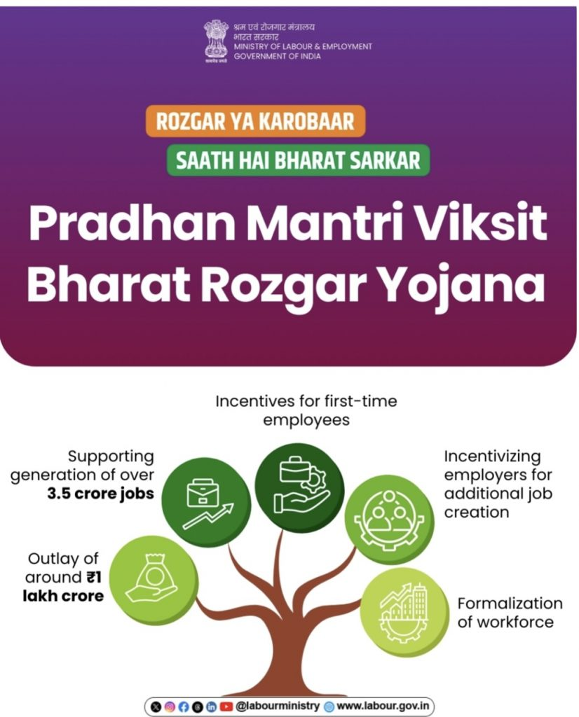 - Pradhan Mantri Viksit Bharat Rozgar Yojana: Launched in 2025 to create over 3.5 crore new jobs through employer and employee incentives with a budget of nearly Rs. 1 lakh crore.