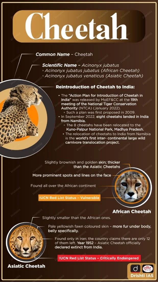 - About: Launched in 2022 under Project Tiger, Project Cheetah aims to bring cheetahs back to India that became extinct in 1952. It is the world's first intercontinental wild carnivore translocation project.