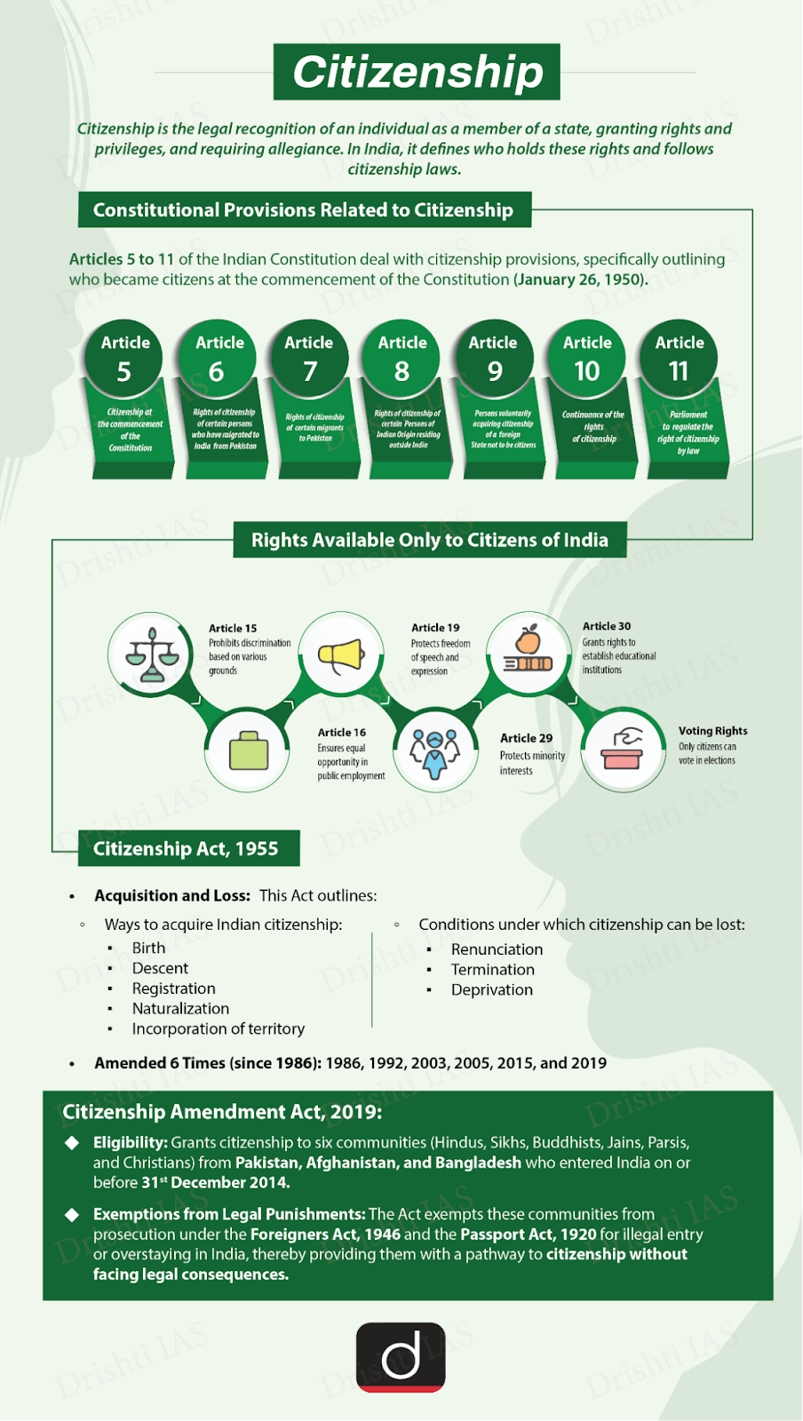 - Section 9, Citizenship Act, 1955: Grants the Centre power to terminate citizenship only in cases where Indian citizens voluntarily acquire foreign citizenship.