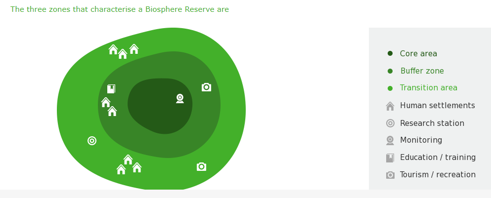 - Transition area: Where communities engage in socio-culturally and ecologically sustainable economic and human activities.