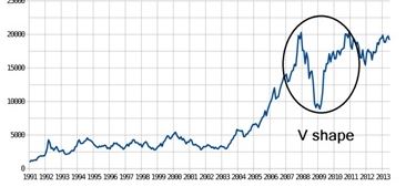 - A V-shaped recovery is different from an L-shaped recovery, in which the economy stays in a slump for a prolonged period of time.