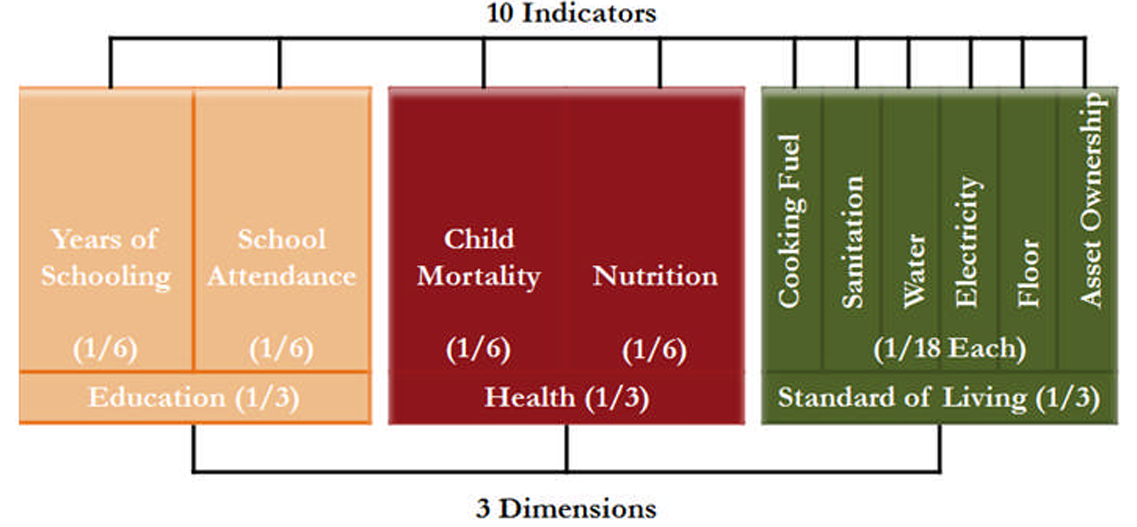 - Computation: The index is built on three core dimensions of poverty: Health, Education, and Standard of Living. These are broken down into 10 specific indicators:
