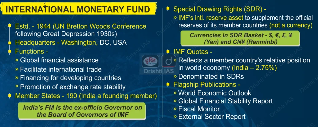 - IMF’s Articles of Agreement: Adopted at United Nations Monetary and Financial Conference in 1944, they serve as the organization’s founding charter and have been ratified by 190 member countries, including India.