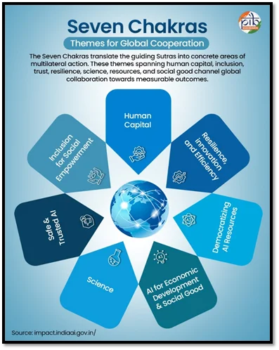 - The Seven Chakras (Working Groups): Focused themes including Health, Agriculture, Safe & Trusted AI, Science, Inclusion, Democratizing AI Resources, and Economic Development.