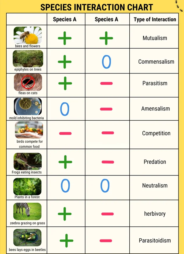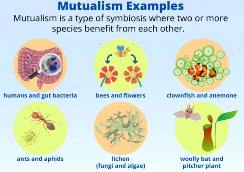 - Mutualism: It is a long-term association between two species where both benefit—such as through food, protection, pollination, seed dispersal, or shelter.