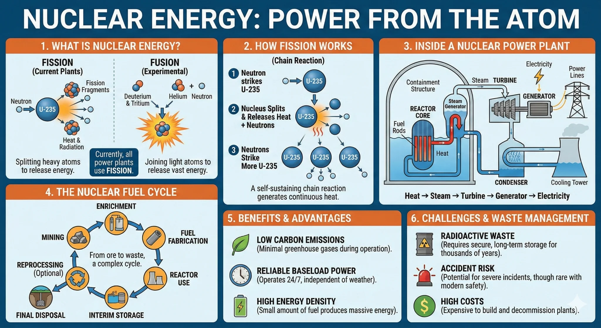 Nuclear energy is the energy released from the nucleus of an atom through fission (splitting) or fusion (combining), with all commercial electricity today produced through fission.