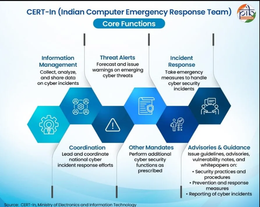 - Functions: CERT-In is responsible for preventing, monitoring, and responding to cyber incidents such as phishing, ransomware, online fraud, AI-enabled scams, and attacks on critical digital infrastructure.