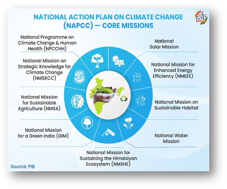 - NAPCC: The National Action Plan on Climate Change (NAPCC) serves as the overarching framework, featuring nine sectoral missions to balance adaptation and mitigation.