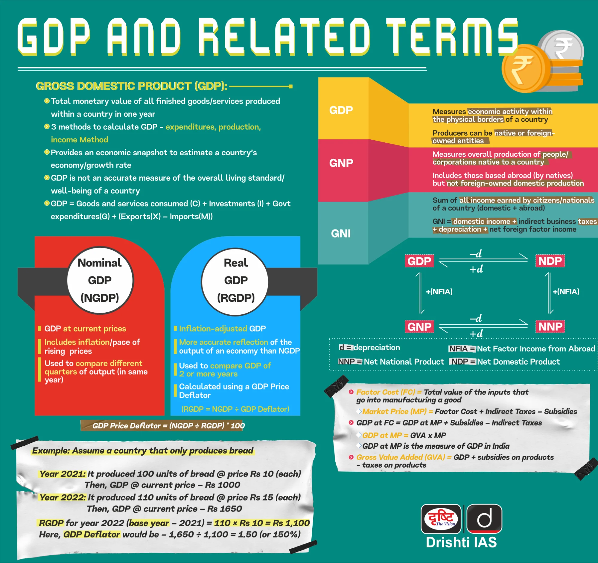 - GDP: It is the value of final goods and services produced within a country in an accounting period.