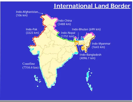 - Indo-Myanmar Border: India's 1,643-km border with Myanmar runs through Arunachal Pradesh (520 km), Nagaland (215 km), Manipur (398 km), and Mizoram (510 km).