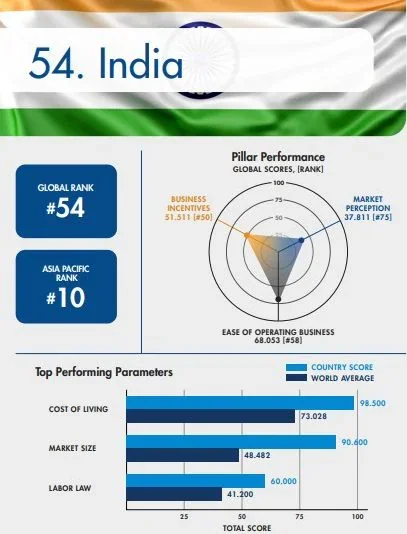 - The report identifies India's business environment as being marked by robust regional strengths, reliable access to capital, a large market size, and a competitive cost structure.