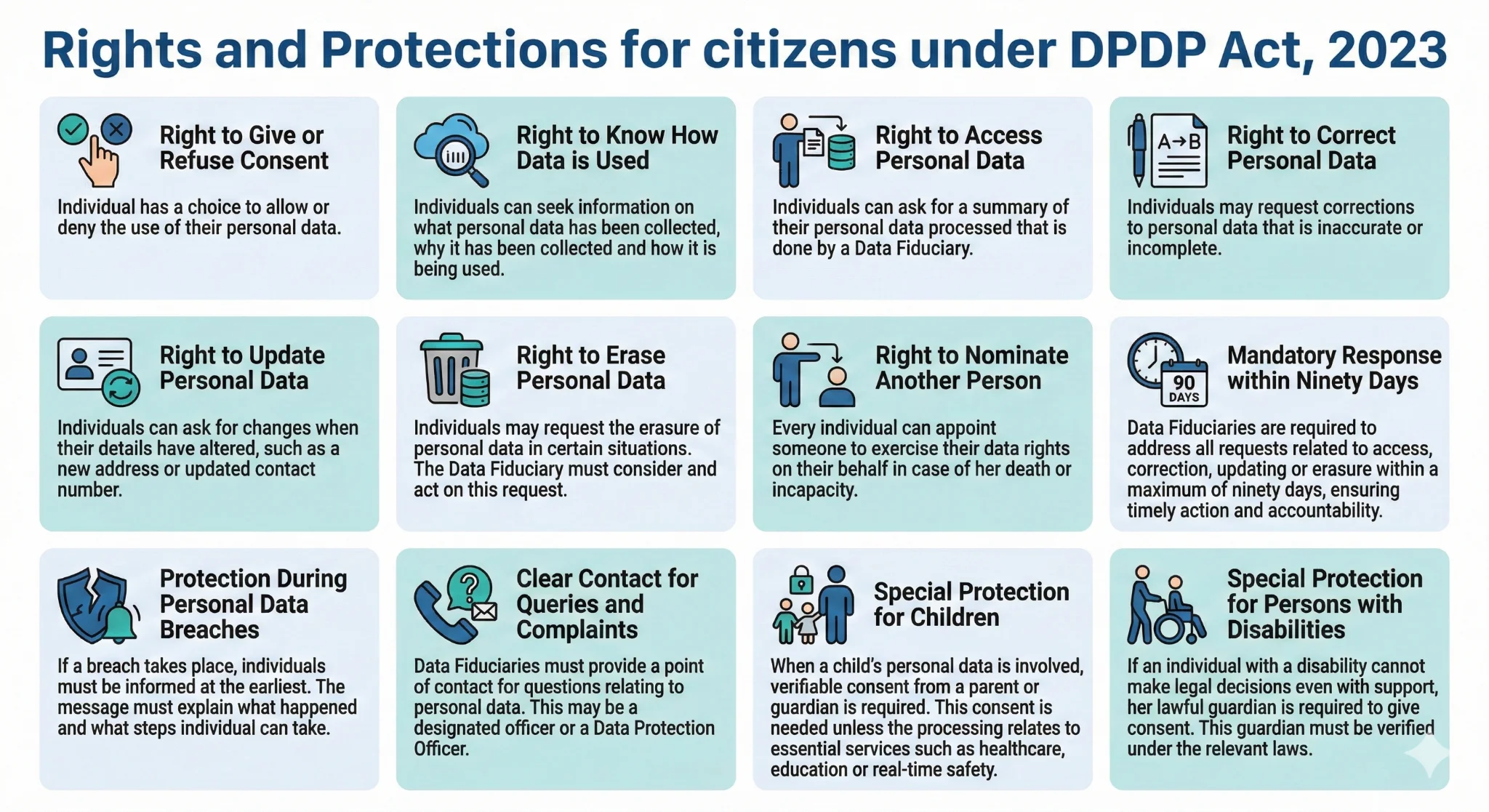 - The Act empowers individuals as Data Principals, granting clear rights and greater control over personal data while ensuring organisations act responsibly, transparently, and accountably.