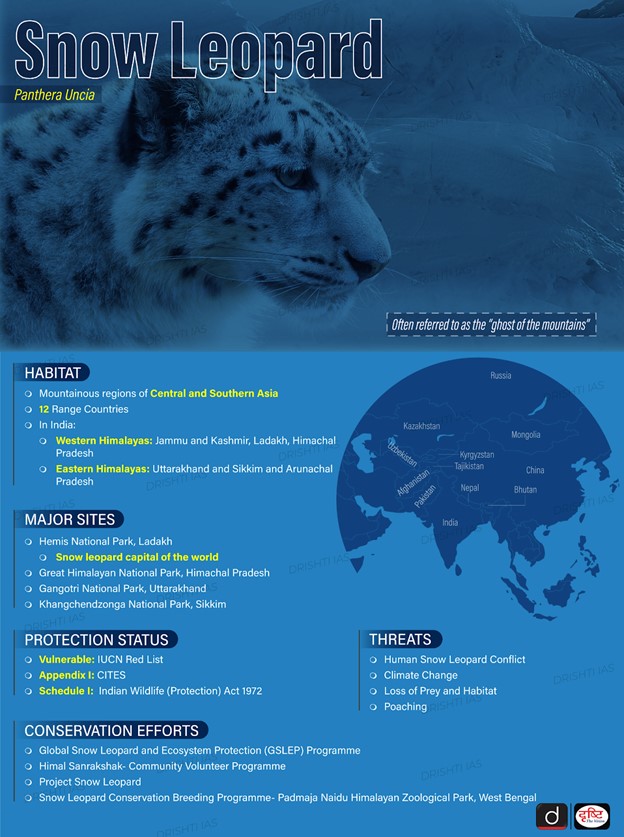 - India’s Conservation Measures: The Snow Leopard Population Assessment (SPAI) reports 718 snow leopards in India, with 477 in Ladakh, marking the first scientific population survey in the Indian Himalayas.