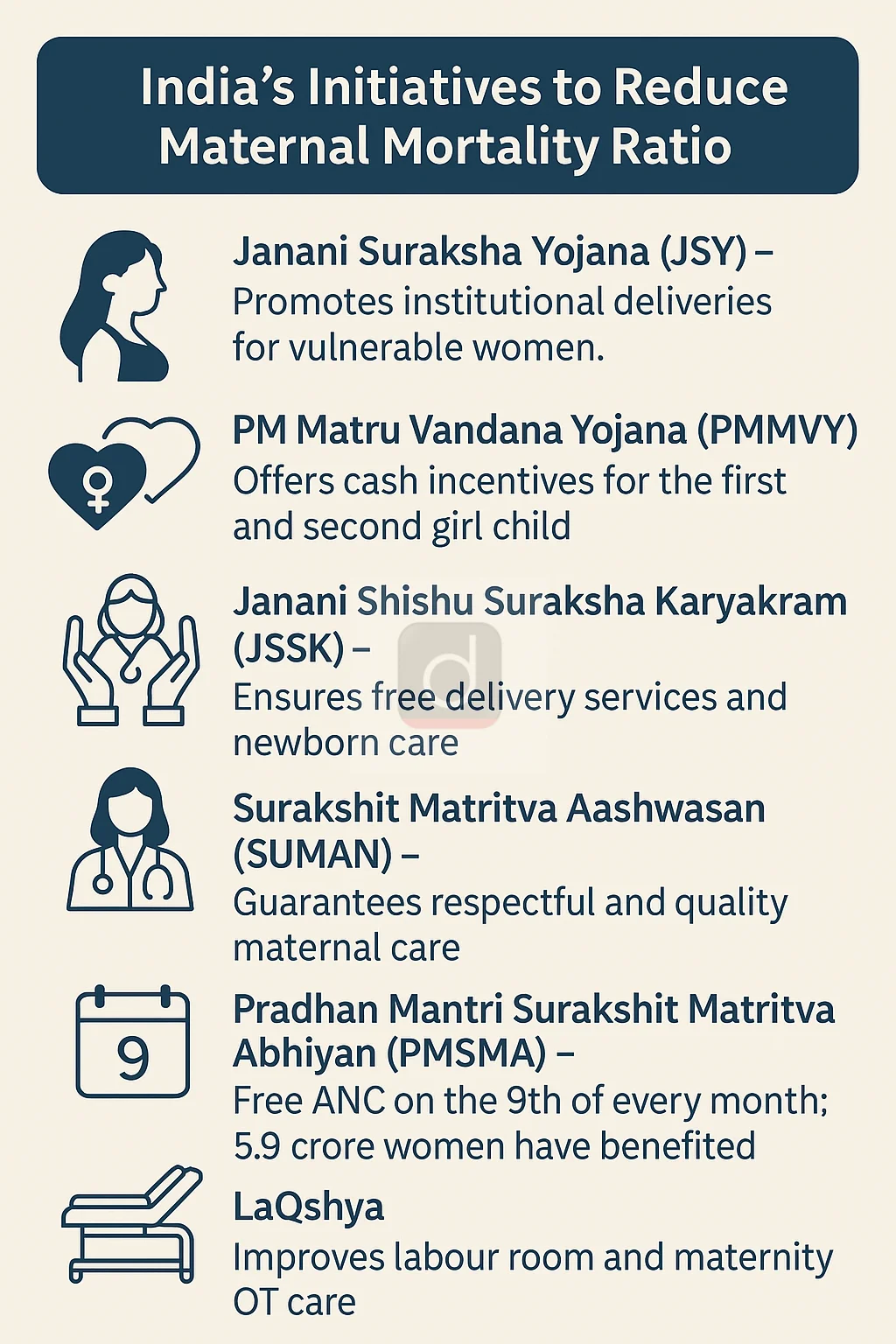 - India still accounts for one in 10 global maternal deaths, with preventable causes like haemorrhages, infections, and blood pressure-related disorders remaining the primary culprits.