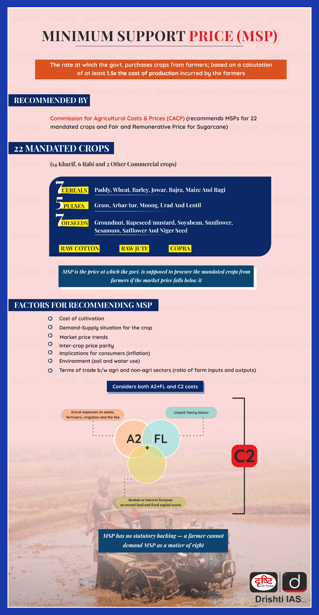 - MSP is declared for 22 mandated crops — including 14 Kharif crops, 6 Rabi crops, and 2 commercial crops — plus a Fair and Remunerative Price (FRP) for sugarcane.