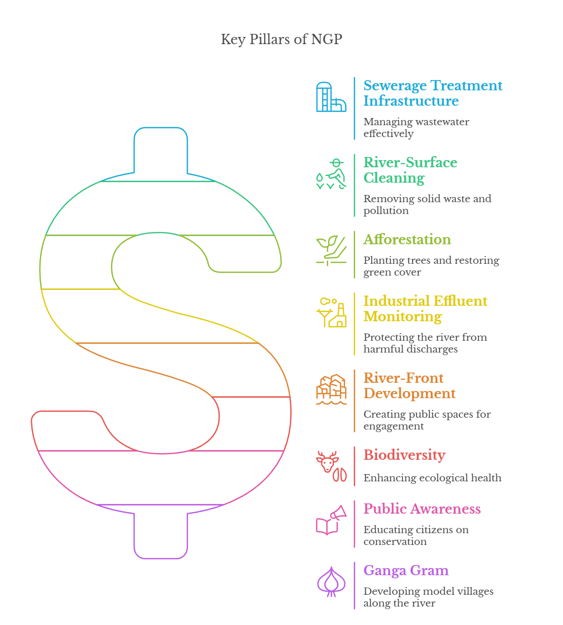 - S-Strict Enforcement of Regulatory Measures: Strictly enforce the Water Act (1974), enabling CPCB/SPCBs to monitor water quality and take action against violators, while the National Green Tribunal (NGT) offers fast-track legal mechanisms to ensure river cleanup and the development of sewage infrastructure.