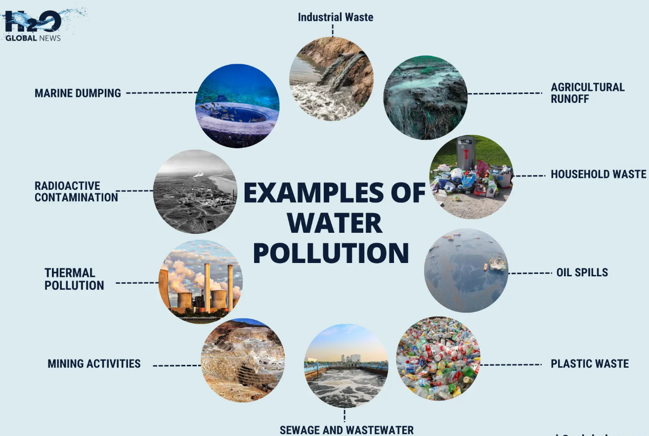 - V-Vast Agricultural Contamination: Excessive fertilizers and pesticides cause agricultural runoff with nitrates and phosphates, triggering eutrophication and harming aquatic life, as in Punjab's Sutlej River.