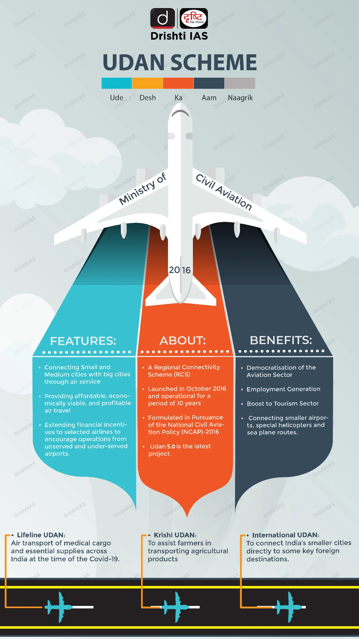 - Launched under the National Civil Aviation Policy (NCAP) 2016, it focuses on connecting Tier-2 and Tier-3 cities through a market-driven yet financially supported model, with the Airports Authority of India (AAI) as the nodal implementing agency.