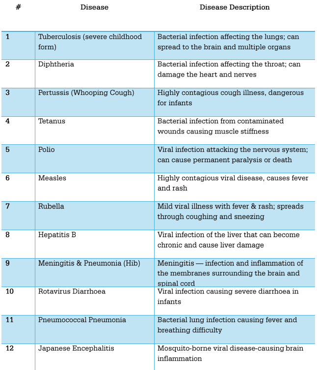 - Diseases Covered: Under UIP, free vaccines are provided to newborns, children, adolescents, and pregnant women against 12 vaccine-preventable diseases.
