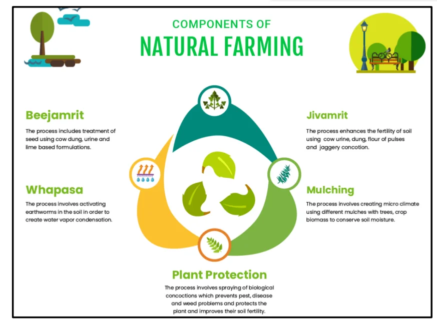 - Definition: As per NITI Aayog, Natural Farming is “a chemical-free traditional farming method” rooted in agroecological principles integrating crops, trees, livestock, and functional biodiversity.
