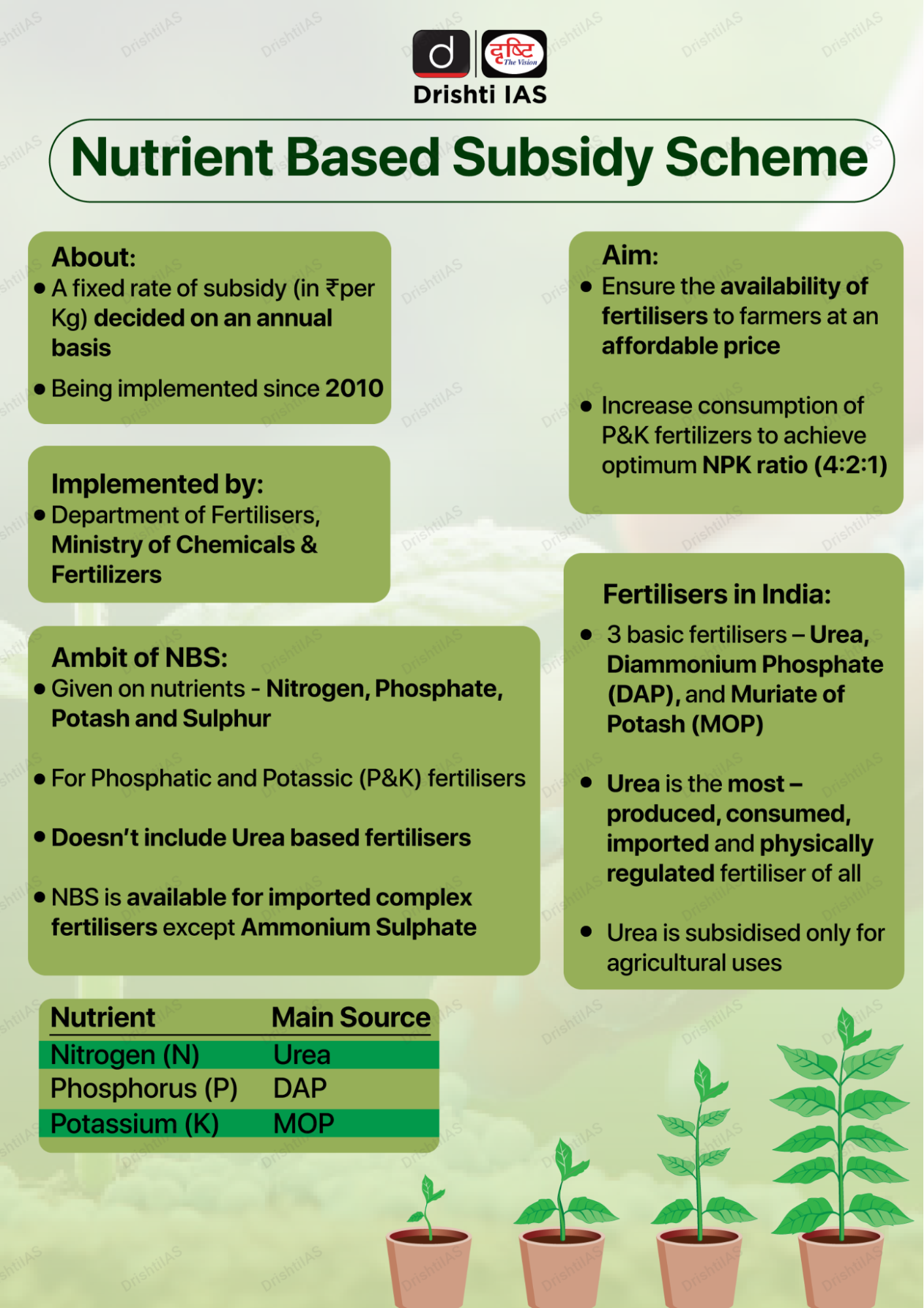 The Nutrient Based Subsidy (NBS) Scheme, launched on 1 April 2010, provides a fixed subsidy (₹/kg) on nutrients N, P, K and S for 28 grades of P&K fertilisers, paid to manufacturers/importers to keep retail prices affordable.