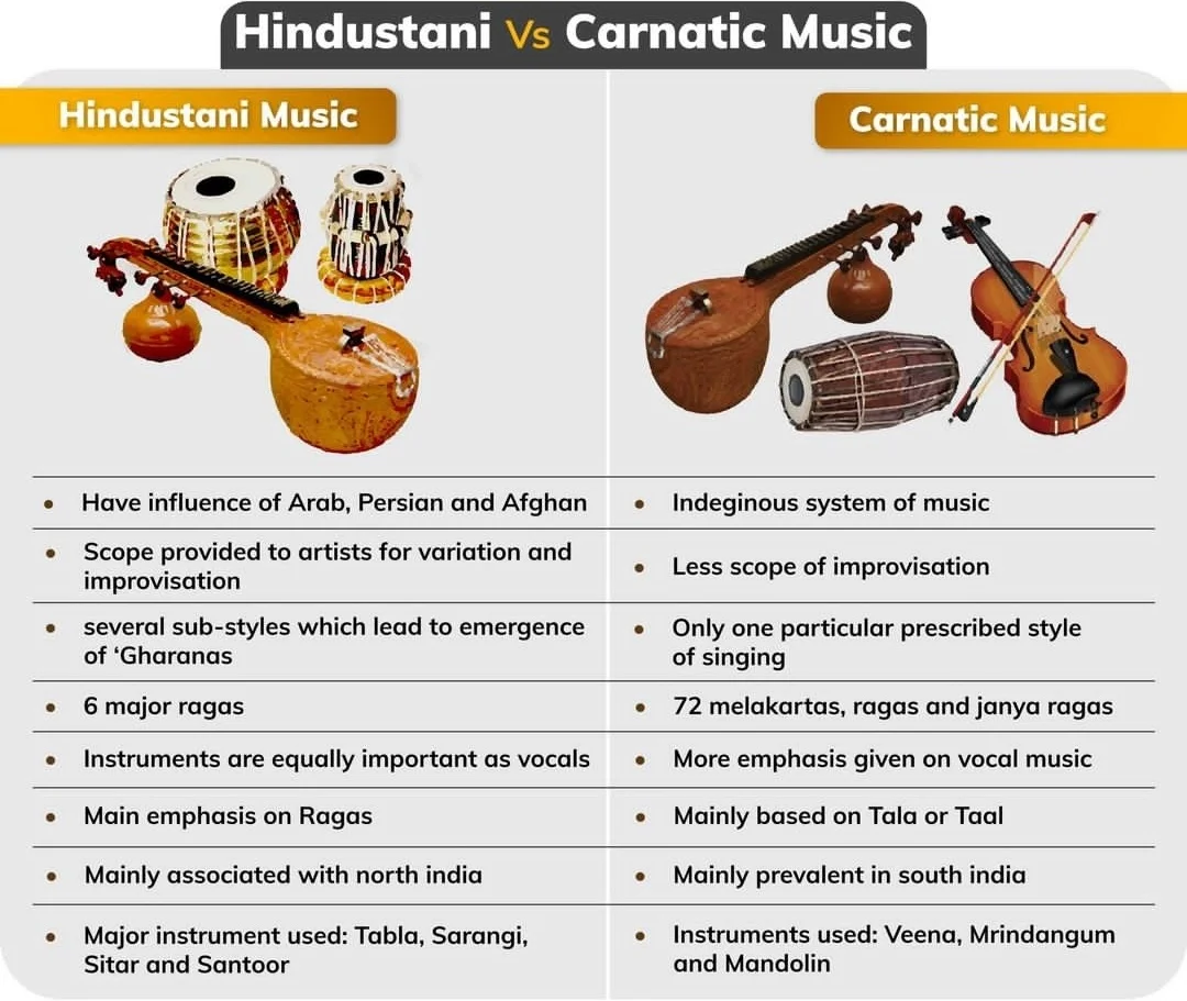 - Core Features & Styles: It is largely vocal-centric, with Dhrupad and Khayal representing Classical Hindustani, while Thumri, Dhamar, Tarana, Tappa, Qawwali, and Ghazal are Semiclassical Hindustani styles.