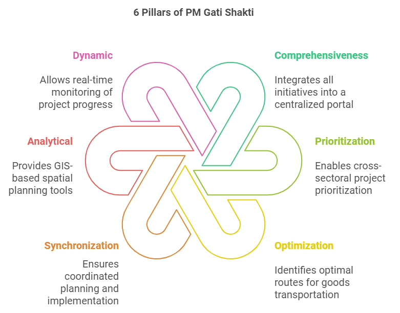 - Acting as a digital backbone, it bridges macro-level planning and micro-level implementation, links existing schemes (Bharatmala, Sagarmala, UDAN), and connects economic zones to boost business competitiveness.