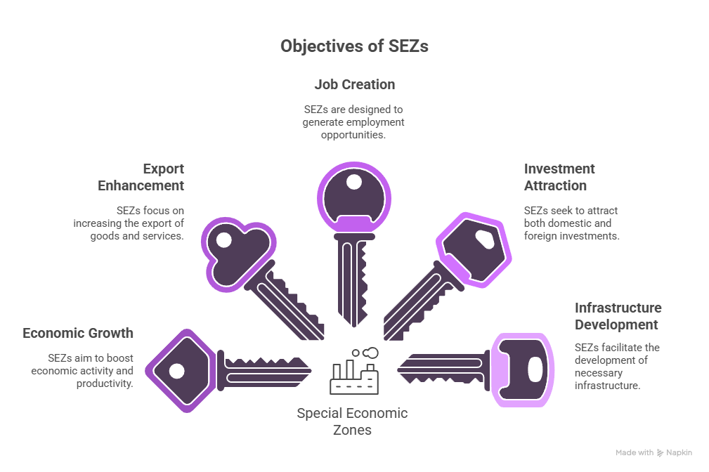 SEZs are designated duty-free areas for trade, manufacturing, and services, aimed at boosting exports, FDI, and industrial growth under the SEZ Act, 2005.