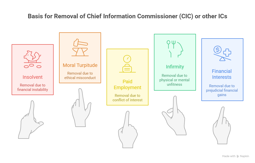 - Tenure and Service Conditions: The Chief ICs or ICs shall hold office for a term prescribed by Central Government or until age 65 years, whichever is earlier.