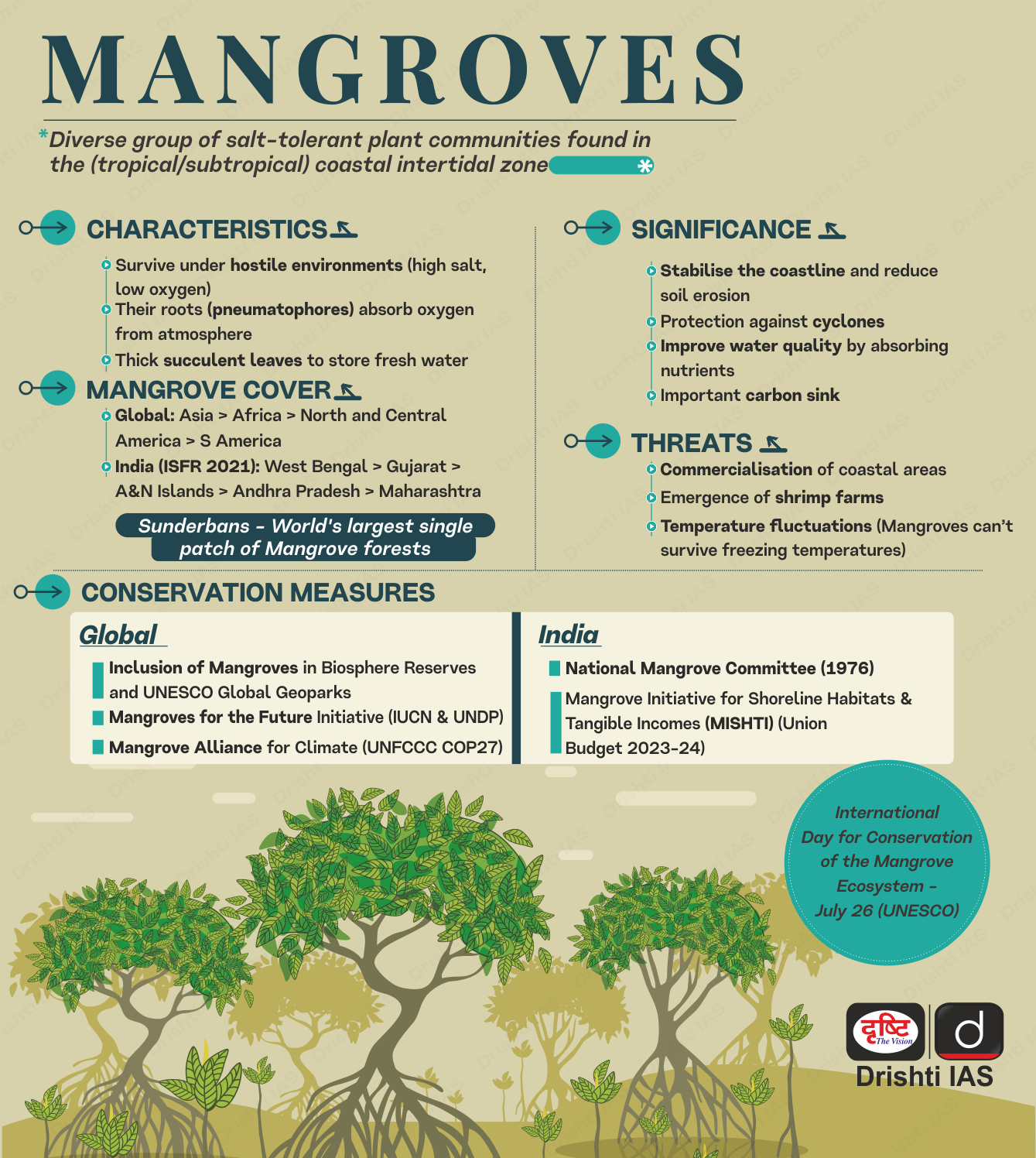 - Ecological Role: It acts as a nursery ground for fish, crabs, and shrimp; mangroves buffer coasts against storms and store carbon.