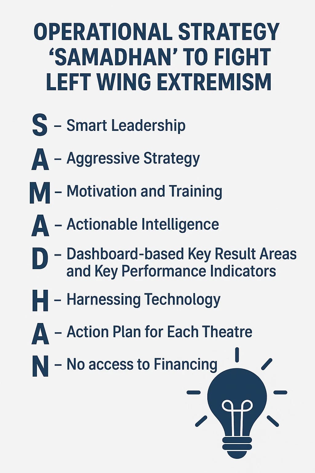 - SAMADHAN Framework: It is MHA’s integrated, multi-dimensional strategy to counter Left Wing Extremism through coordinated security action, technology, leadership, and development. It combines policing reforms with targeted operations and denial of Maoist finances.
