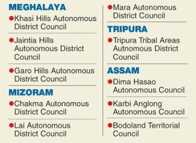 - Autonomous Districts Council: The tribal areas in these four states have been constituted as autonomous districts. The Governor is empowered to organise and reorganise the autonomous districts.