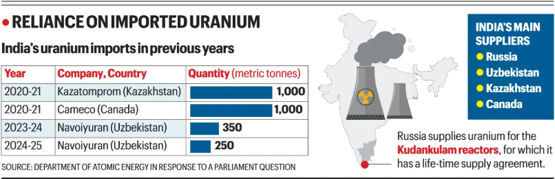 - परमाणु ऊर्जा एक विश्वसनीय तथा निम्न-कार्बन ऊर्जा स्रोत प्रदान करती है, जो भारत के स्वच्छ ऊर्जा संक्रमण को समर्थन देती है। दीर्घकालिक यूरेनियम अनुबंध आगामी परमाणु रिएक्टरों के लिये स्थिर ईंधन आपूर्ति सुनिश्चित करते हैं।