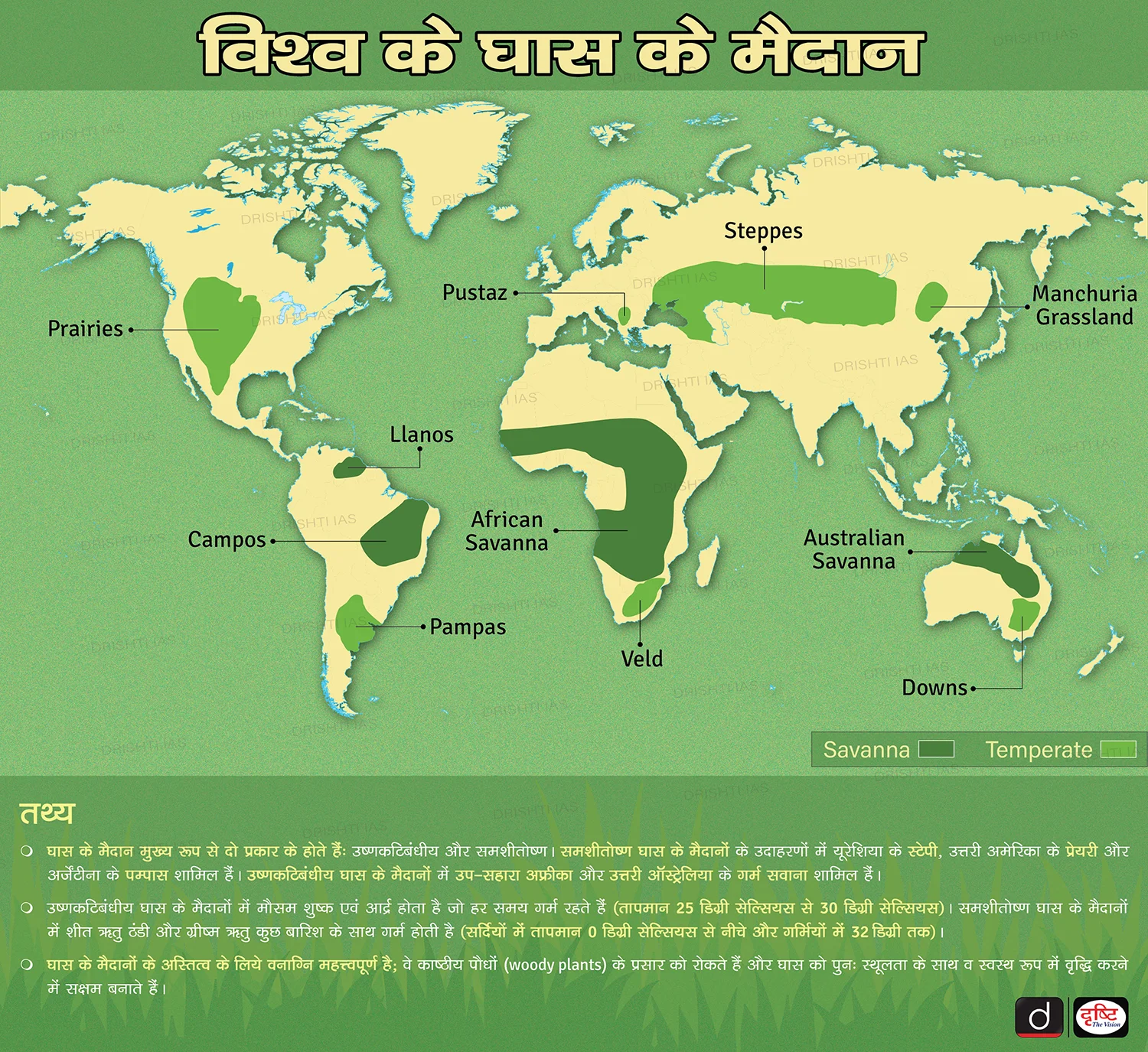 - चरागाह, जिसमें घास के मैदान, सवाना, रेगिस्तान और झाड़ीदार भूमियाँ शामिल हैं, जैव विविधता, पारिस्थितिकी विनियमन और जलवायु लचीलापन के लिये महत्त्वपूर्ण हैं।