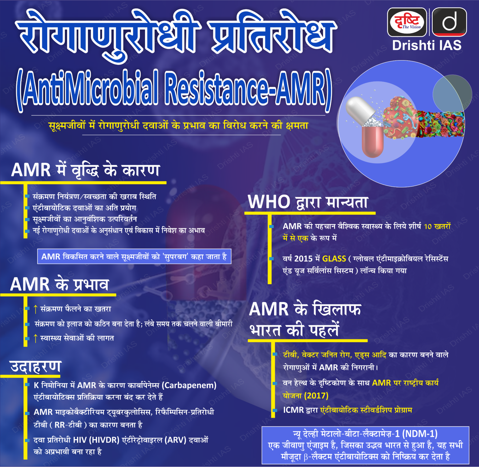 - AMR: AMR एक ऐसी घटना है जिसमें बैक्टीरिया, वायरस, कवक और परजीवी समय के साथ विकसित होते हैं और उन्हें नष्ट करने के लिये बनाई गई दवाओं (जैसे एंटीबायोटिक्स, एंटीवायरल और एंटीफंगल) पर प्रतिक्रिया नहीं करते हैं।