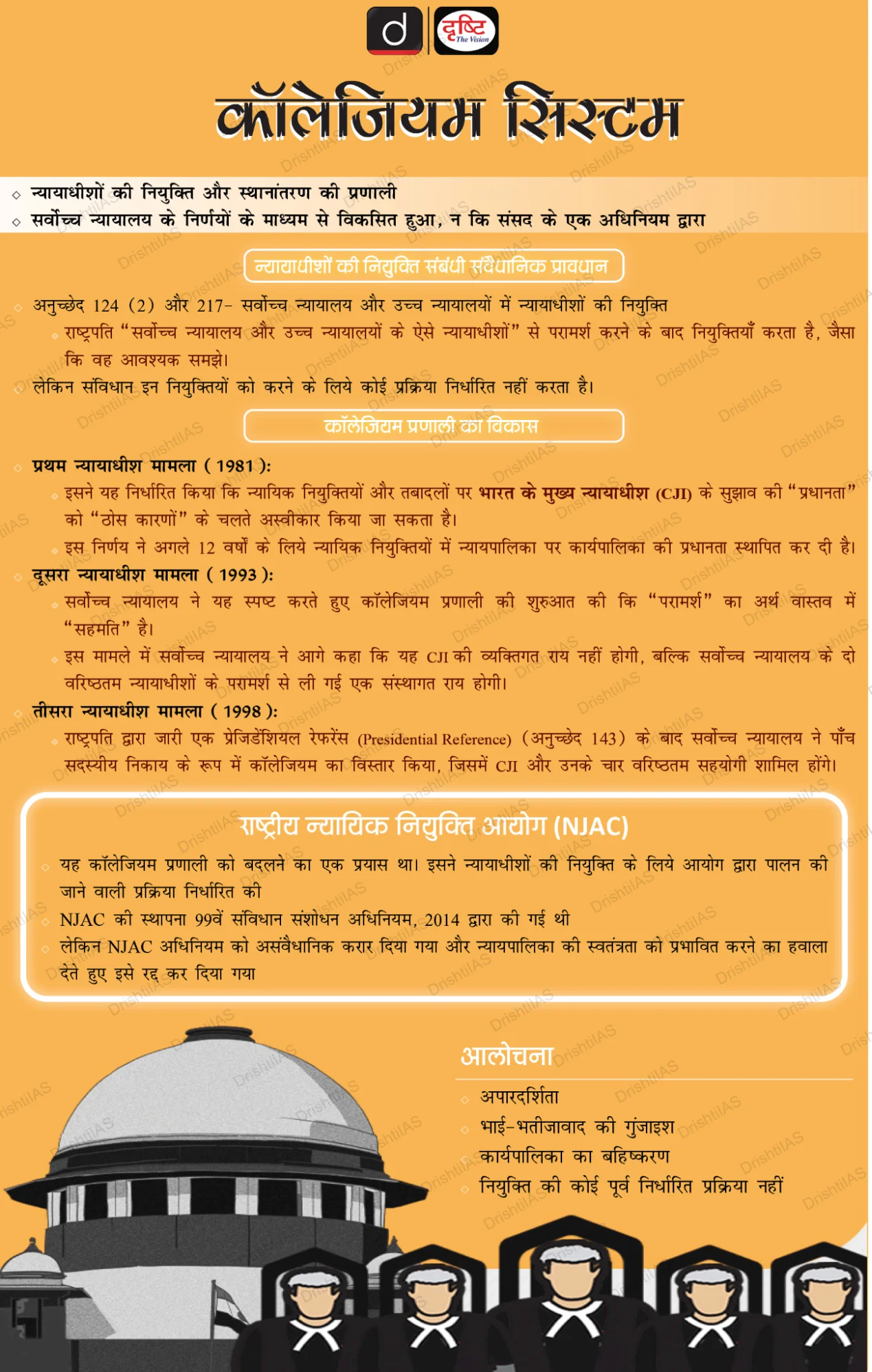 - NJAC: विशेषज्ञ राष्ट्रीय न्यायिक नियुक्ति आयोग (NJAC) के संशोधित स्वरूप को पुनः लागू करने की वकालत करते हैं।