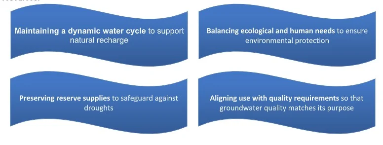 - भूजल प्रबंधन की मूल आधारशिला भूजल (जलभृतों) के कार्य और उपयोग, समस्या एवं दबाव (संकट), प्रबंधन उपायों के प्रभाव हैं।