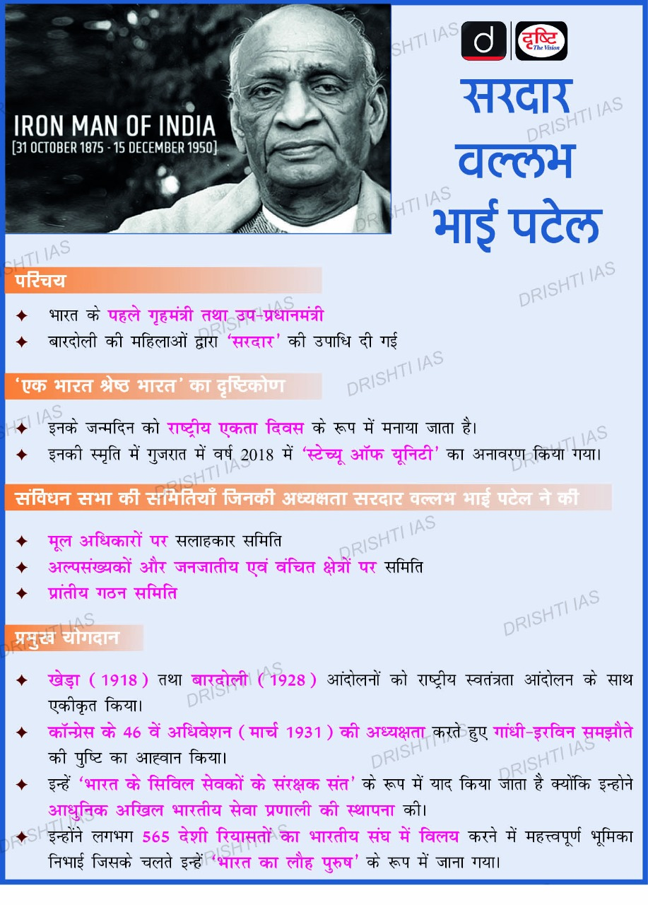 - वल्लभभाई पटेल ने भारत के पहले उप प्रधानमंत्री और गृहमंत्री के रूप में वर्ष 1947 के बाद 560 रियासतों को एकीकृत भारत में शामिल करने का कार्य किया।