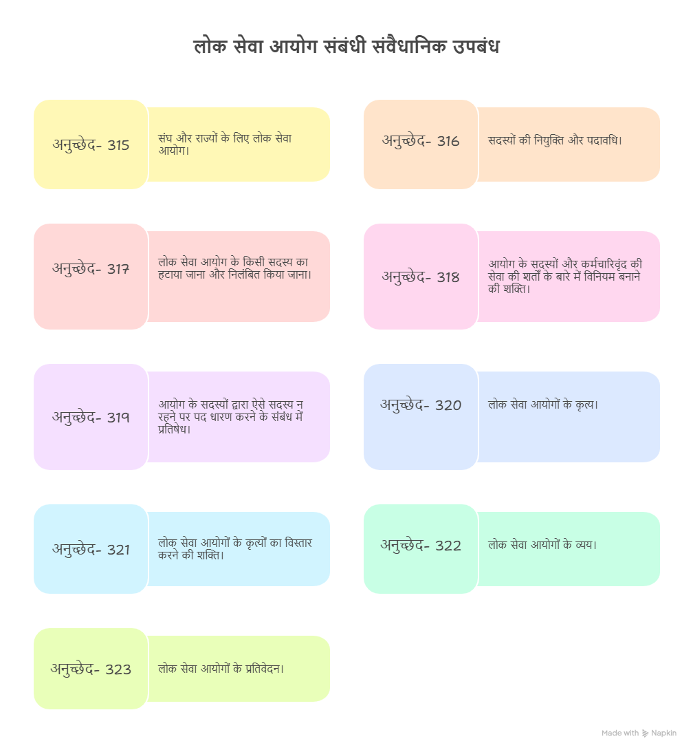 - UPSC और राज्य लोक सेवा आयोग स्वतंत्र संवैधानिक निकाय हैं। भारतीय संविधान के अनुच्छेद 315 से 323 (भाग XIV) उनकी संरचना, नियुक्ति, सदस्यों को हटाने तथा उनकी शक्तियों और कार्यों को नियंत्रित करते हैं।