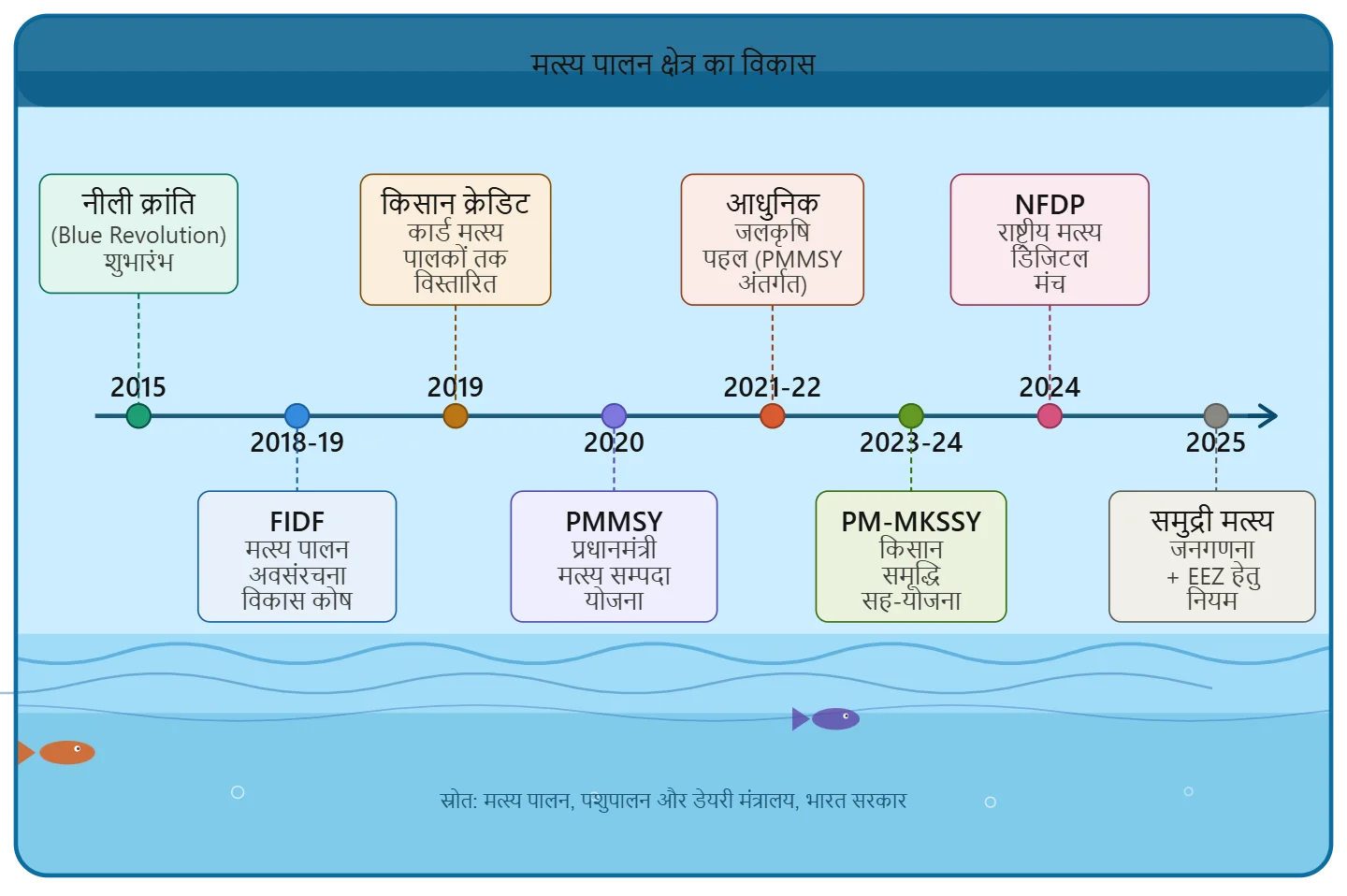 - डिजिटल शासन: वर्ष 2024 में शुरू किया गया नेशनल फिशरीज़ डिजिटल प्लेटफॉर्म (NFDP) 30 लाख से अधिक हितधारकों को डिजिटल पहचान प्रदान करता है, जिससे बीमा और सब्सिडी तक पहुँच आसान हो जाती है।