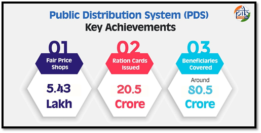 - यह प्रणाली राष्ट्रीय खाद्य सुरक्षा अधिनियम (NFSA), 2013 के अंतर्गत संचालित होती है, जो वर्ष 2011 की जनगणना के अनुसार भारत की लगभग दो-तिहाई जनसंख्या को शामिल करती है।