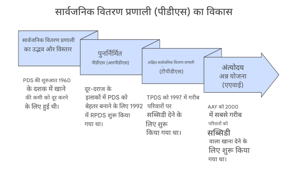 - परिचय: PDS का उद्देश्य खाद्य सुरक्षा सुनिश्चित करना है, जिसके तहत गेहूँ, चावल, मोटा अनाज आदि आवश्यक खाद्यान्न कम दरों (सब्सिडी मूल्य) पर समाज के कमज़ोर वर्गों को उपलब्ध कराए जाते हैं।